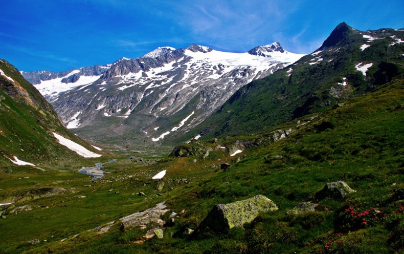 3Már tegnap is közel kerültünk a magashegységhez, de ma még magasabbra törünk. Hinterbichl (1331 m) falucskájából jó két óra alatt túrázhatunk fel a 2116 méteren fekvő Johannishütté-ig. De ha úgy döntünk, hogy ezt az időt, s persze a 800 méter szintet inkább megspóroljuk magunknak, akkor a helyi iránytaxi segítségét is igénybe vehetjük, amely 20-25 perc alatt felrepít minket a fantasztikus panorámájú szerpentinúton a Johannishütte-hez. Már itt incselkednek velünk a hatalmas hegyek, jól rálátni balról a Grosser Happ (3350 m), jobbról a Weißspitze (3300 m) csúcsaira. Igazi alpesi hangulatú völgykatlanban kaptatunk fölfelé, ahol ezer színben pompázó virágmezők mellett haladunk el. A hegyekből lefolyó patakok útját olykor-olykor keresztezve túrázunk egész a Defreggerhaus alatti völgyig. Innen a menedékházhoz egy erősebb kaptatón megyünk föl, a túrabot itt nagy segítségünkre lehet. Elérve a házat fantasztikus panoráma nyílik az alattunk húzódó völgyre és a környező hegygerincekre. Ebben a megkapó környezetben fogyasztjuk el ebédünket. A bátrabbakkal felkapaszkodunk a ház mögötti kisebb kaptatón egy csipkézett gerincre, ahonnan fantasztikus kilátás nyílik nem csupán az osztrák hegyek Királynőjére, a 3666 méter magas Grossvenedigerre, és a Rainer Horn (3559 m) alattunk elterülő jégfolyamára, de közel 30 másik 3000 fölötti csúcsot is megcsodálhatunk. Innen visszatérünk a Johannishüttehez, ahol elfogyaszthatjuk a jól megérdemelt hideg sörünket, majd élményekkel gazdagodva visszatérünk a kempingünkbe. Szállás sátorban, avagy igény esetén panzióban.