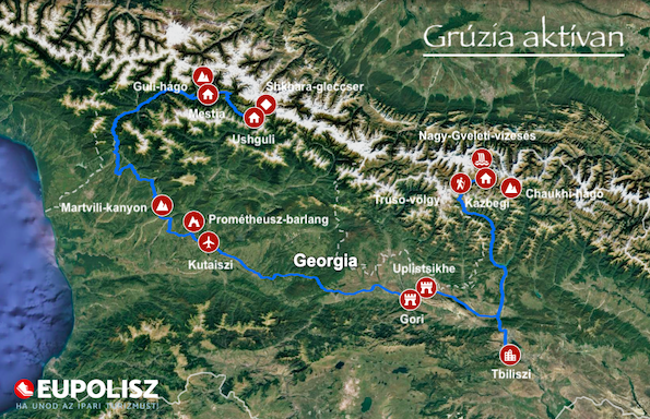 Ezekre a területekre utazunk: Grúzia, Svanetia, Kutaiszi, Kaukázus. Grúzia: Területe 69 700 km2. Északon a Kaukázus, délen a Kis-Kaukázus láncai húzódnak, közöttük fekszik a Rioni folyó völgye, az ún. Kolhisz, amely a Fekete-tengerhez fut ki. Szomszédos országok: Oroszország, Örményország, Törökország, Azerbajdzsán. Fővárosa Tbiliszi, 1.4 millió lakossal. Lakosság száma 5,5 millió (grúz 70%), pravoszláv vallásúak, de élnek területén török és örmény kisebbségek is. Hivatalos nyelve a grúz, az orosz a második legelterjedtebb nyelv, és egyre többen beszélnek angolul.