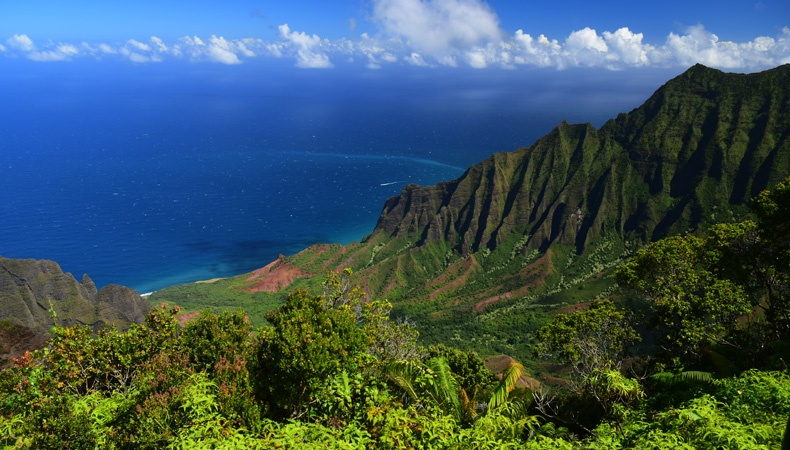 Kalalau trek a Na Pali parton, táv: 13 km oda-vissza, szintkülönbség: 550 m le, 550 m fel, menetidő: 6-7 óra. -