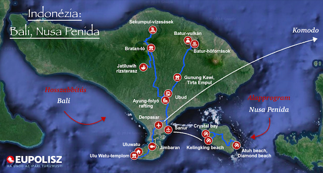 Figyelem! Hosszabbítási lehetőség a Komodo, Nusa Penida alapprogram után! Öt napos extra programmal várjuk azokat, akik Bali misztikus szigetét is alaposabban megismernék - vagy ha már jártak itt, visszatérnének ide! A kiegészítő program során Balira utazva elsősorban a természeti látnivalókra és az aktív programokra koncentrálunk: raftingolni indulunk Bali egyik legvadregényesebb folyóján, napkeltenézésre kapaszkodunk fel a Batur vulkán kalderájára, fürdünk a dzsungel mélyén