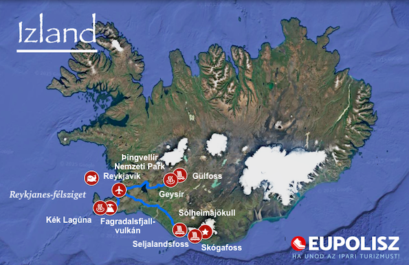 Budapest - Reykjavík (Keflavík) - Budapest útvonalon repülővel, majd a továbbiakban a városok és a városokon kívüli látnivalók között végig bérelt busszal utazunk, helyi sofőrrel. Reykjavík, és a többi nevezetesség felfedezése gyalog fog történni.