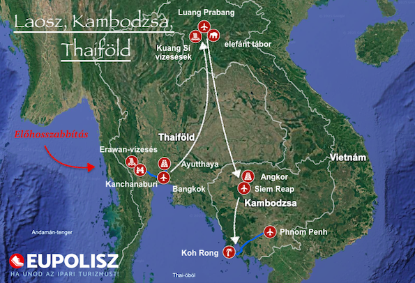 Budapesttől menetrendszerű nemzetközi repülőjárattal érkezünk első szállásunkra Bangkokba, ahol a program kezdődik. Thaiföldön, Kambodzsában és Laoszban szintén menetrendszerű repülőjáratokkal, menetrendszerű és bérelt buszokkal, komppal, tuk-tukokkal, valamint iránytaxival utazunk. Angkort tuk-tuk segítségével járjuk be, ahol a helyenként poros úton jól jön egy porfogó kendő az arc elé.