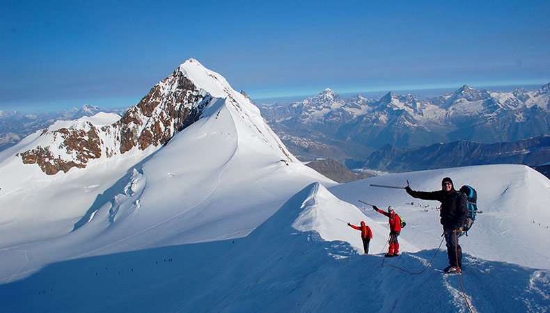 4Reggeli kelés után bemelegítés gyanánt elindulunk a felettünk magasodó két négyezres csúcs megmászására. Mintegy 600 méternyi emelkedés után elsőként a Piramide Vincent 4215 méter magas csúcsát másszuk meg. Ezután leereszkedünk egy kisebb nyeregbe, majd a Balmenhorn 4167 méteres sziklás csúcsán egyensúlyozó bivakházhoz kapaszkodunk fel. Innen egy rövid pihenő után kényelmesen visszaereszkedünk a Gnifetti menedékházhoz, ahol korai fekvéssel készülünk fel a másnapi megerőltető túránkra.Szintemelkedés: gyalog: 760 m, menetidő: 5-6 óra, táv: 8 km gyalog -