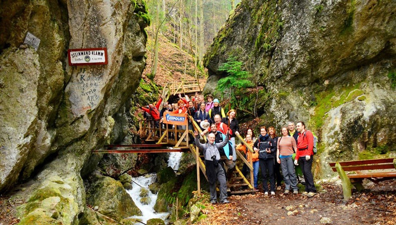 2Találkozó 5:00-kor a XI ker. Pázmány Péter sétány és a Magyar Tudósok krt. sarkán levő parkolónál (az ELTE új épületei mellett, a Petőfi-hídtól 3 percre, az A38 hajó magasságában). Indulás 5:15-kor. Várhatóan jó 5 órás utazást követően érjük el az Alsó-Ausztria egyik legszebb és leghíresebb vízeséséhez vezető túra kiindulópontját. A Myra patak folyását követve kezdjük vadregényes túránkat. Jól kiépített és könnyen járható úton haladunk egy szurdok gyomrában, hol a patak bal, hol pedig a jobb oldalán haladva gyorsan elérjük az első meseszép vízeséseket és szikalmedencéket. Miután kigyönyörködtük magunkat a magasról zúgó víz látványában, egy meredek, kaptatós, de biztonságos útvonalon felkapaszkodunk a már messziről megcsodált sziklafok, a Hausstein csúcsára is. Innen leereszkedve egy erdei úton túrázunk tovább Alsó-Ausztria egyik legszebb, vadregényes szurdokvölgyéhez, a Steinwandklamm-hoz. A szurdokban folyó patak mentén folytatjuk a túránkat, lépcsők és létrák segítségével kapaszkodva egyre feljebb a hatalmas sziklafalak között. A túra csúcspontját kétségtelenül az a közel 20 méteres vaslétra jelenti, melyen át a Wildschützenloch apró barlangjához jutunk. Az izgalom garantált! (Akik esetleg ettől a létrától megrettennek, azok számára kerülőút lehetséges!) Kitartó emelkedés után végül elérjük a Türkenloch-ot, egy másik barlangot, melyen keresztülvisz az útunk. Befelé egyre sötétebb lesz, de nem kell megijedni, nem zsákutca. Miután újra kiértünk a fénybe, a sziklafal mentén még felmászhatunk a szikla tetejére, ahol véget ér a szurdok. Innen rövid séta csak a közeli vadászfogadó, ahol egy meleg leves, avagy jól megérdemelt bécsi szeletek, és kupa sörök mellett próbálunk megnyugodni. Végül a már ismerős úton térünk vissza buszunkhoz, majd hazaindulunk. Érkezés Budapestre az esti órákban.