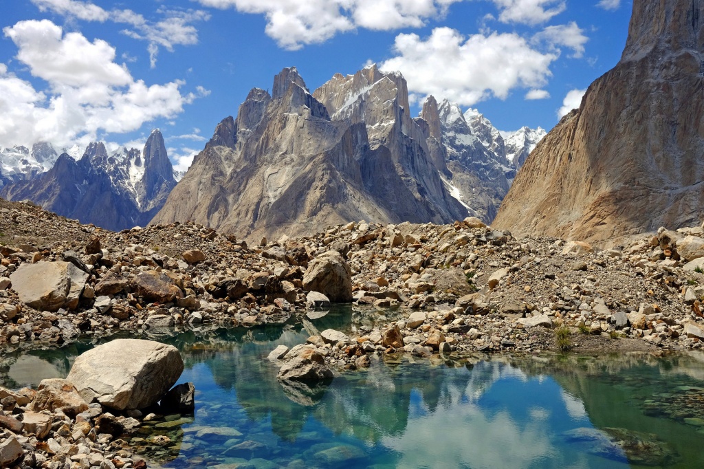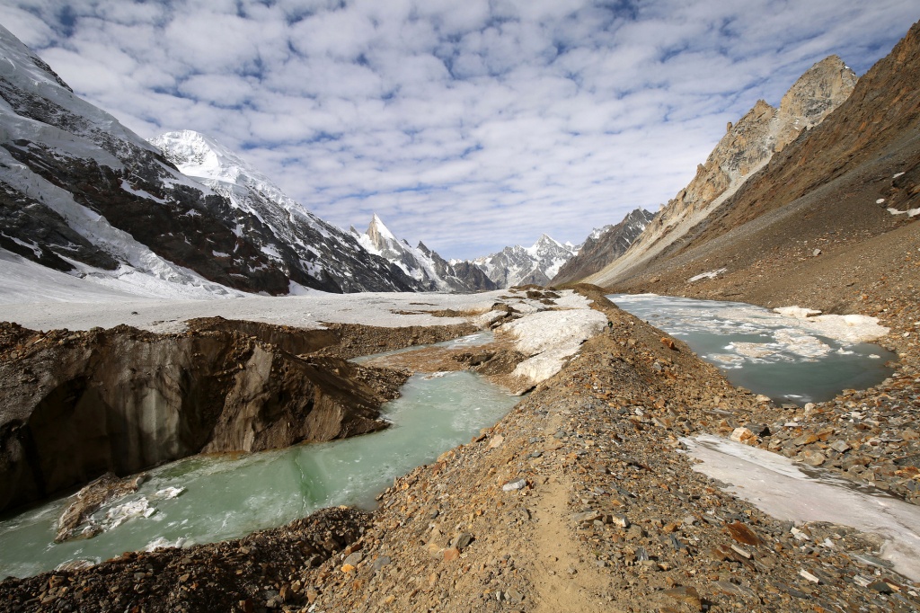 3Ezen a napon már egy kemény szakaszra kell számítani, hiszen főként az állandóan változó, mozgásban lévő, törmelékkel borított gleccserfelszínen haladunk. A túra nehézségét az adja, hogy immáron a Baltoro-gleccser morénáin gyaloglunk, többnyire hullámzó, köves, nehezen járható terepen. Indulás után aztán már nem sokkal egyre inkább drámaibbá válik a tájkép, elképesztő hegyek tűnnek fel, többek közt a Trango-tornyok és az Uli Biaho égig érő csúcsai. Ösvényünk egy idő után átvezet majd minket a Baltoro-gleccseren Liligo irányába, innen pedig a gleccser szélét követjük majd egészen a kicsivel 3800 méter alatt fekvő Khoburtse-táborig. Itt már nincsenek fák, a tábor viszont teraszos helyszín, vízzel bőven ellátva, fantasztikus kilátással a 6000-es sziklatornyokra. (Táv 14,5 km, szint: 800 m, menetidő: 7-8 óra) Szállás: kétszemélyes sátorban, ellátás: reggeli, ebéd, vacsora. -