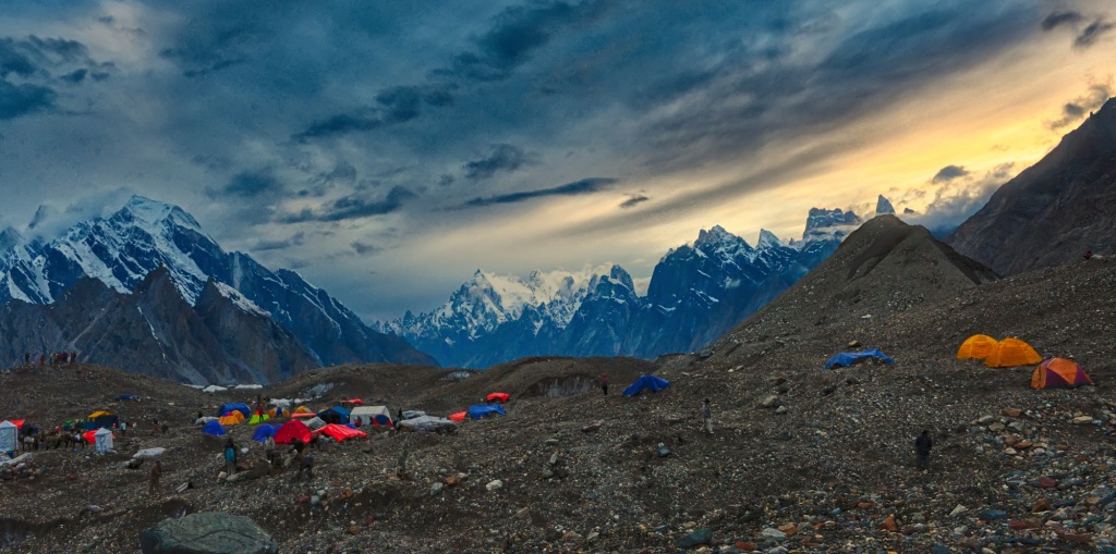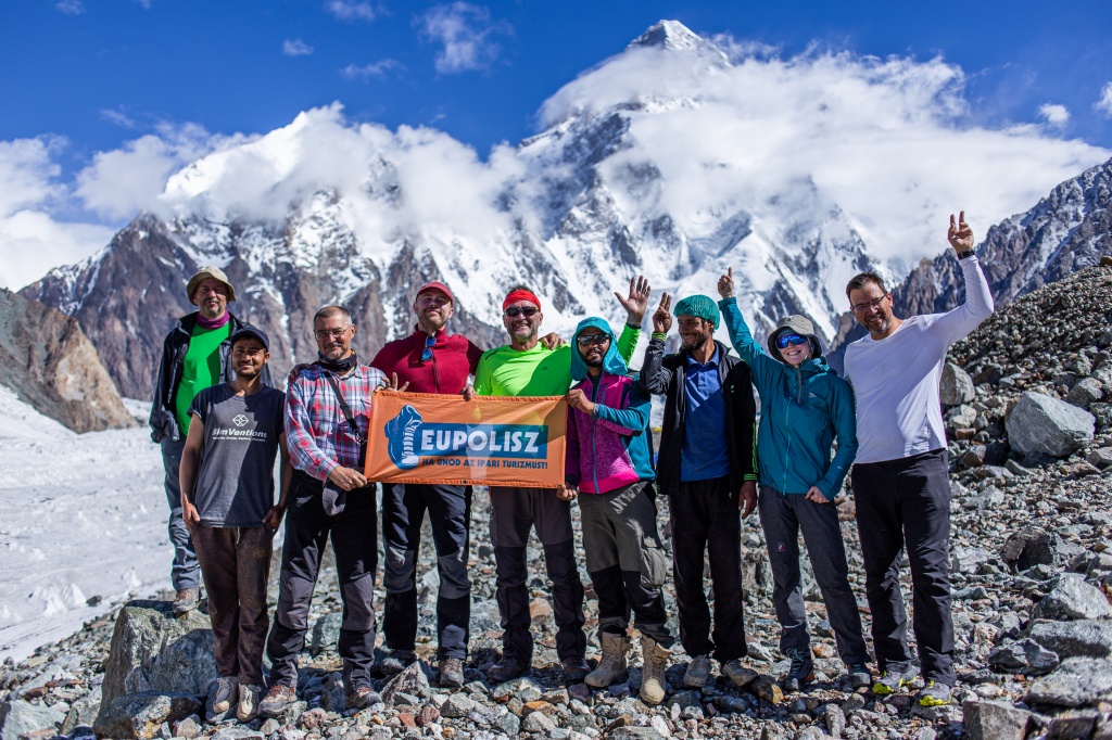 4Sokáig emlékezetes napunk kora reggel veszi kezdetét. A már-már megszokott, gleccserek melletti morénákon, folyamatosan változó törmelékes ösvényen vezet mai utunk is, amelyen haladva nagyjából 3-4 óra után érjük el a Broad Peak alaptáborát. Ebédünket is itt fogyasztjuk el, miközben az előttünk magasodó hegy apró részleteit is megfigyelhetjük. Folytatva túránkat rátérünk a Godwin Austen-gleccser hatalmas jégfolyamára, majd egy nagyjából két órányi menetelés után elérjünk első nagyobb célunkat, a K2 alaptáborát, és ott fogunk állni túránk egyik csúcspontján, a 8611 méteres K2 közvetlen közelében, Földünk egyik legkülönlegesebb szegletében. A legkitartóbb túratársakkal egy kisebb kitérővel felkapaszkodunk az 5080 méteren fekvő Art Gilkey emlékhelyhez, itt lépjük át túránk során először az 5000 méteres magasságot. A híres amerikai geológus és hegymászó 1953-ban a K2 mászás közben lelte halálát, az ő tiszteletére emelt emlékmű azóta pedig az összes olyan hegymászónak állít emléket, akik a világ második legmagasabb hegyének megmászása közben vesztették el életüket. Az emlékhely után visszaereszkedünk a táborba, elfoglaljuk a sátrakat, majd hátizsákjaink nélkül bejárjuk az alaptábort. A naplemente sokáig emlékezetes fényeit még lefotózzuk, majd vacsora után korán nyugovóra térünk. (Táv 14 km, szint: 600 m, menetidő: 8-9 óra) Szállás: kétszemélyes sátorban, ellátás: reggeli, ebéd, vacsora. -