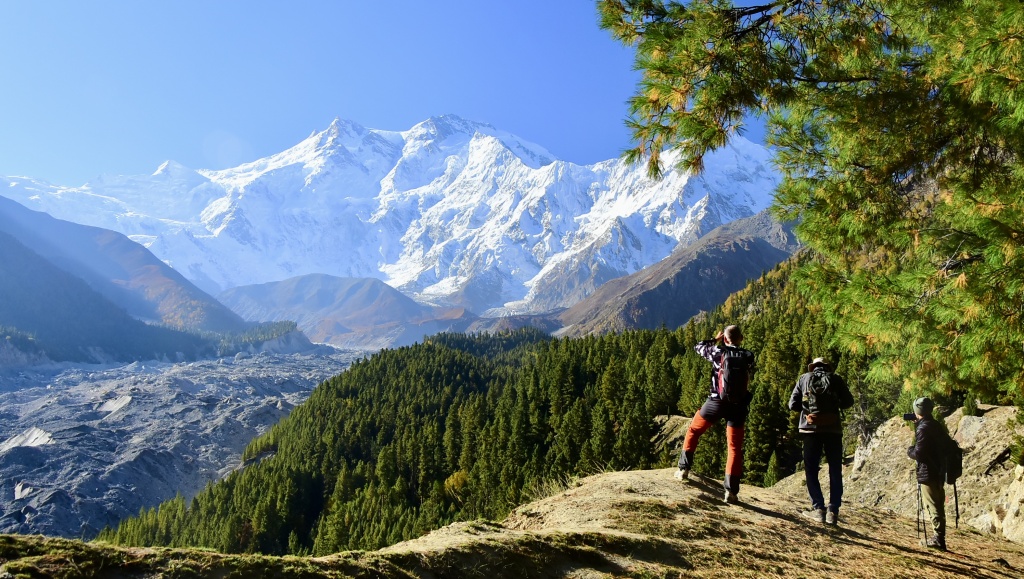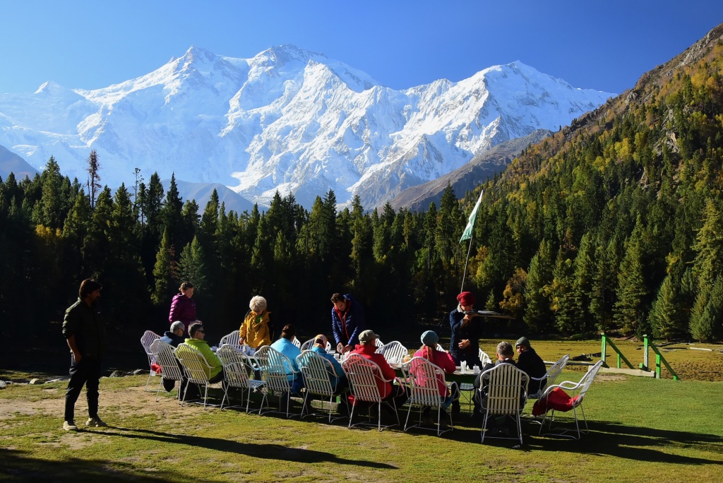 3Ma elhagyjuk bázisunkat, Skardut, s az Indus folyását követve, annak mély völgyében haladunk a három nagy hegységrendszer, a Himalája, a Karakoram és a Hindukush találkozási pontját jelölő kilátóig, ahol fotószünetet tartunk. Immár a Karakoram Highway-t követve ereszkedünk le a híres Raikot Bridge-hez, amely az Induson átvezető, stratégiai fontosságú híd. Itt már a Himalájában járunk. Az Indus itt mindössze 1.150 m-en fut, ám fölötte, a tőle délre induló lejtők és völgyek közvetlenül a 8.126 m magas Nanga Parbatra vezetnek! Itt vagyunk a Himalája legnyugatibb hegyóriásának lábánál! Innen mi is meredeken a magasba tartunk, de ehhez terepjárókba kell átszállnunk. A Tattoo-völgyben színes terepjárókkal kapaszkodunk egyre magasabbra a sziklafalba vájt, merész vonalvezetésű, egysávos ösvényen. A látvány kétségtelenül lélegzetelállító. De a napból egy közel 3 órás gyalogos túra sem hiányozhat - hiszen aznapi végcélunk csak így érhető el. Végül a Meserét (Fairy Meadows) valóban mesés tájára jutunk. A háttérben a Nanga Parbat gigászi tömbje magasodik - majdnem 5000 méterrel magasabban, azonban itt még alpesi jellegű erdők is megélnek. Alattunk a völgyben ér véget a hegyóriásról ereszkedő, 14 km-es Rakhiot-gleccser - amit másnap majd követünk, miközben a hegy alaptáborába túrázunk. Szállás: Fairy Meadows, turistaszállás, ellátás: reggeli, vacsora. (túratáv: 5 km, szintemelkedés: 650 méter fel, menetidő: 2.5-3 óra) -